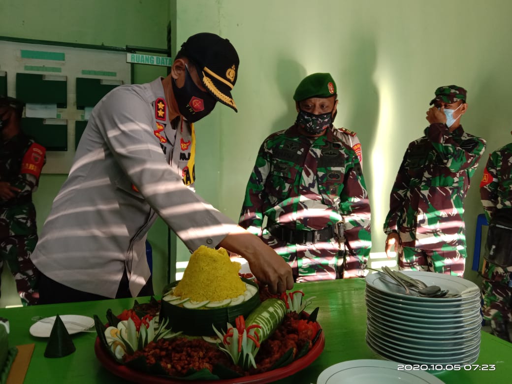 KONAWE – Peringati hari jadi Tentara Nasional Indonesia (TNI) ke 75 tahun 05, Oktober 2020. Kapolres Konawe bersama Pejabat Utama (PJU) silahturahmi ke Kantor Komando Rayon Militer (Koramil) 1417 -07 Unaaha, Senin (5/10/2020). Sekaligus membawa nasi tumpeng dan kue ulang tahun.