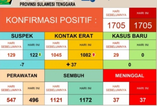 Menurutnya, pada hari ini, tidak ada penambahan pasien yang terinveksi virus corona. Sehingga total kasus Covid-19 di Sultra masih tetap 1.705 orang.