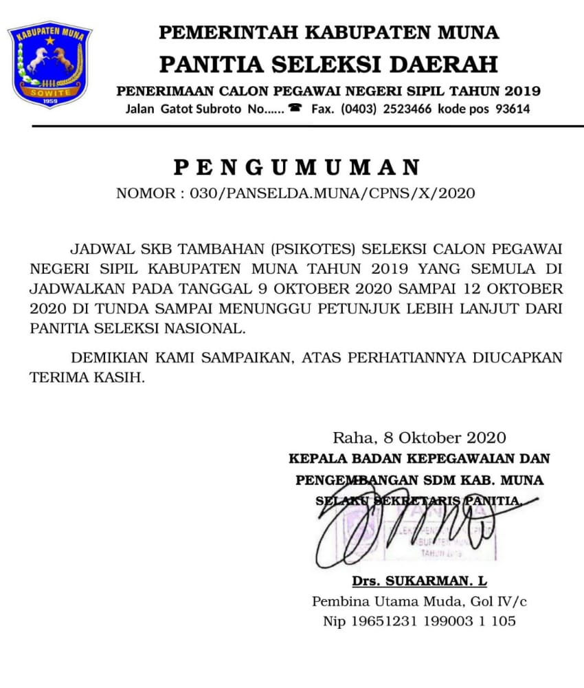 Penundaan tersebut tertuang dalam pengumuman yang dikeluarkan oleh Pemerintah Kabupaten (Pemkab) Muna melalui Badan Kepegawaian dan Pembangunan Sumber Daya Manusia (BKPSDM) setempat bernomor 030/ PANSELDA. MUNA/ CPNS/X/2020.